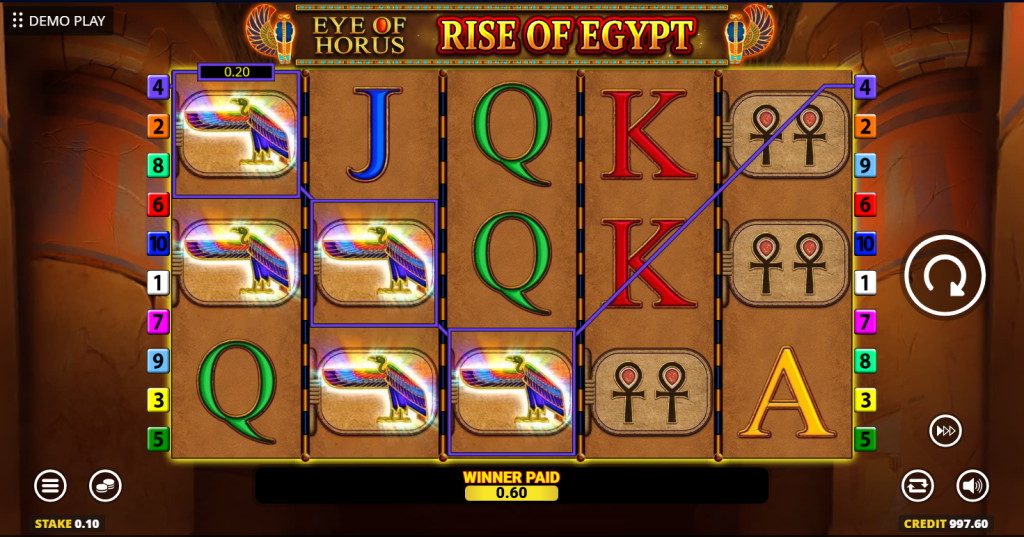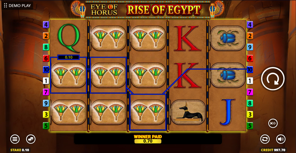 🎰 Demo screen of Eye of Horus — Rise of Egypt slot showing Egyptian symbols and card letters on the reels. A winning payline is highlighted 📈 with a small payout displayed at the bottom 💰. The interface shows spin controls 🔄, paylines numbers, and a 0.10 stake.